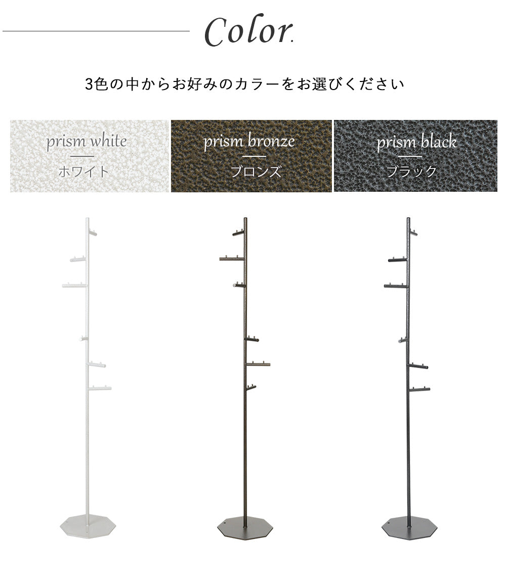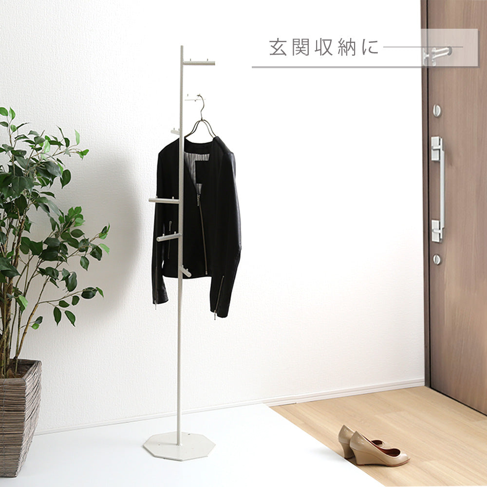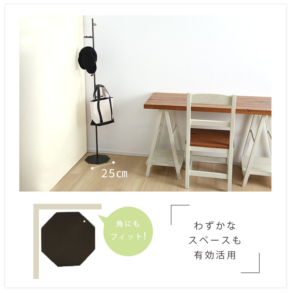 らせん状に付けられたフックは、掛けたもの同士が干渉しないように設計されているので、ほしいものをサッと手に取ることができます。洋服やバックが重なり合って必要な物が見つからないなんてこともありません。た八角形のかたちが、お部屋の角やちょっとした隙間にもピッタリフィット。お部屋のわずかなスペースを有効活用できるので、玄関やリビング、寝室など様々な場所でお使いいただけます。