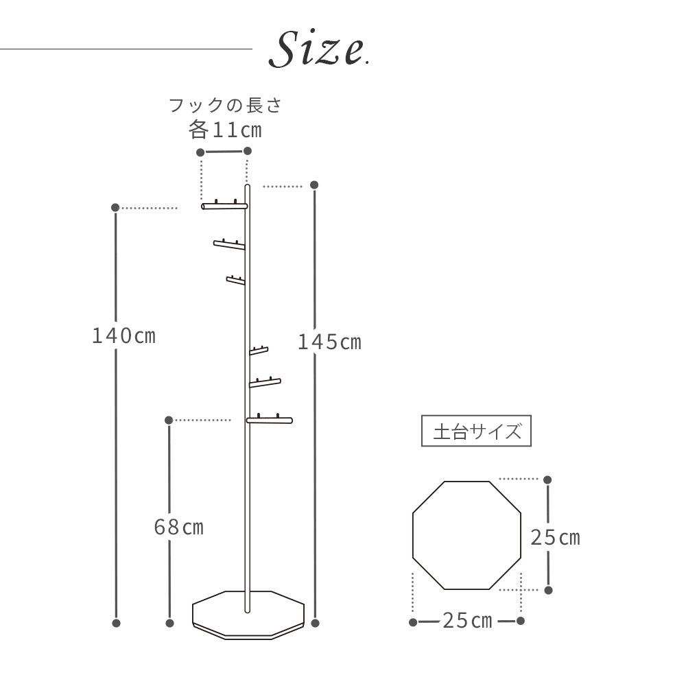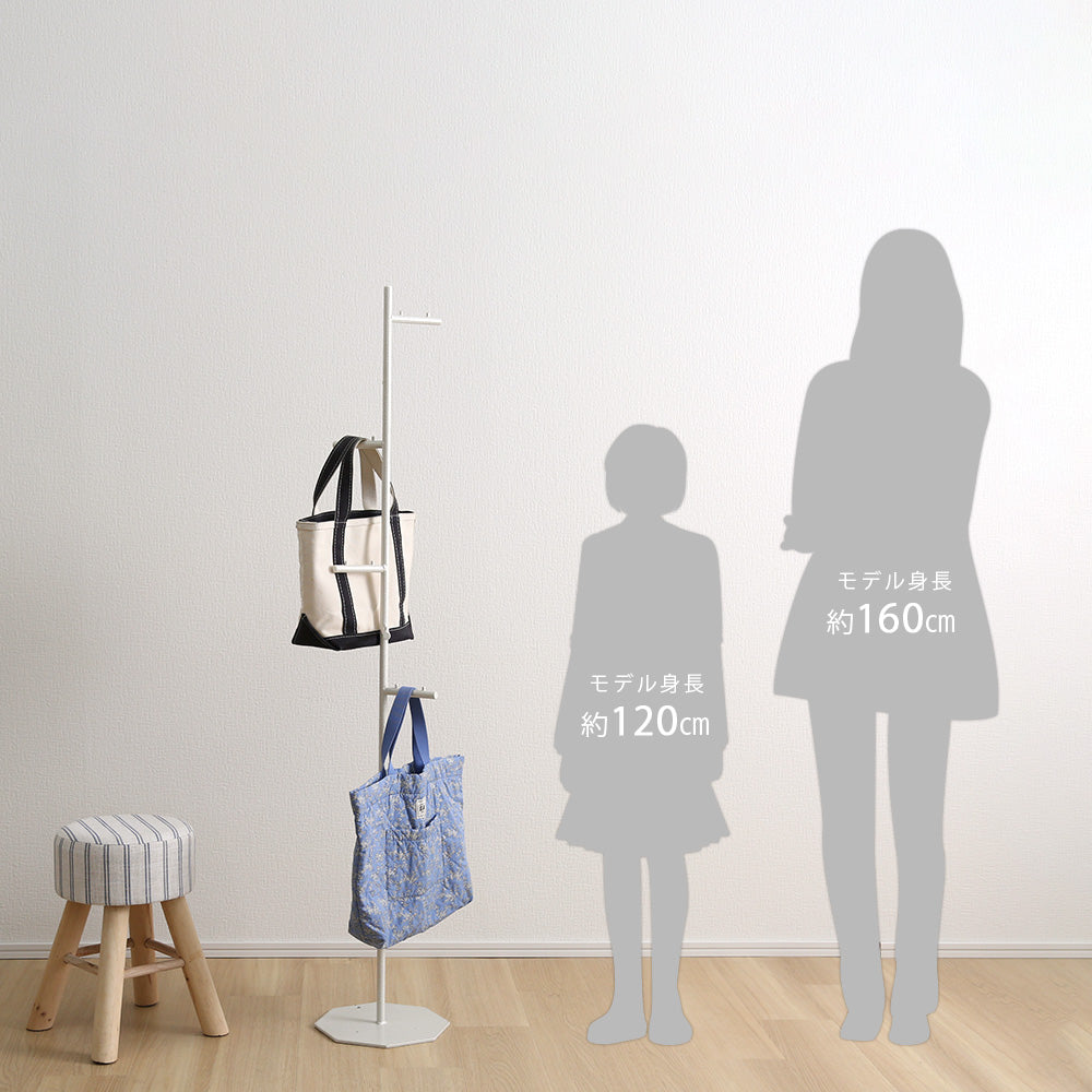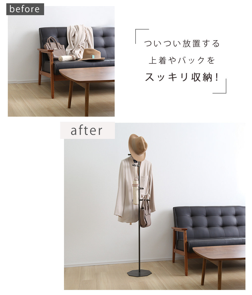 らせん状に付けられたフックは、掛けたもの同士が干渉しないように設計されているので、ほしいものをサッと手に取ることができます。洋服やバックが重なり合って必要な物が見つからないなんてこともありません。た八角形のかたちが、お部屋の角やちょっとした隙間にもピッタリフィット。お部屋のわずかなスペースを有効活用できるので、玄関やリビング、寝室など様々な場所でお使いいただけます。