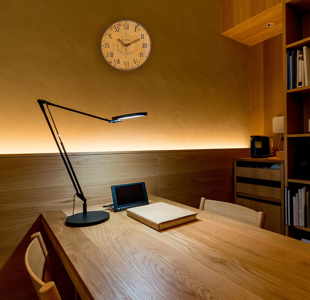 ゴールドの秒針もアクセントとして欠かせない差し色、真鍮留めのアクリルカバーで高級感も演出します。