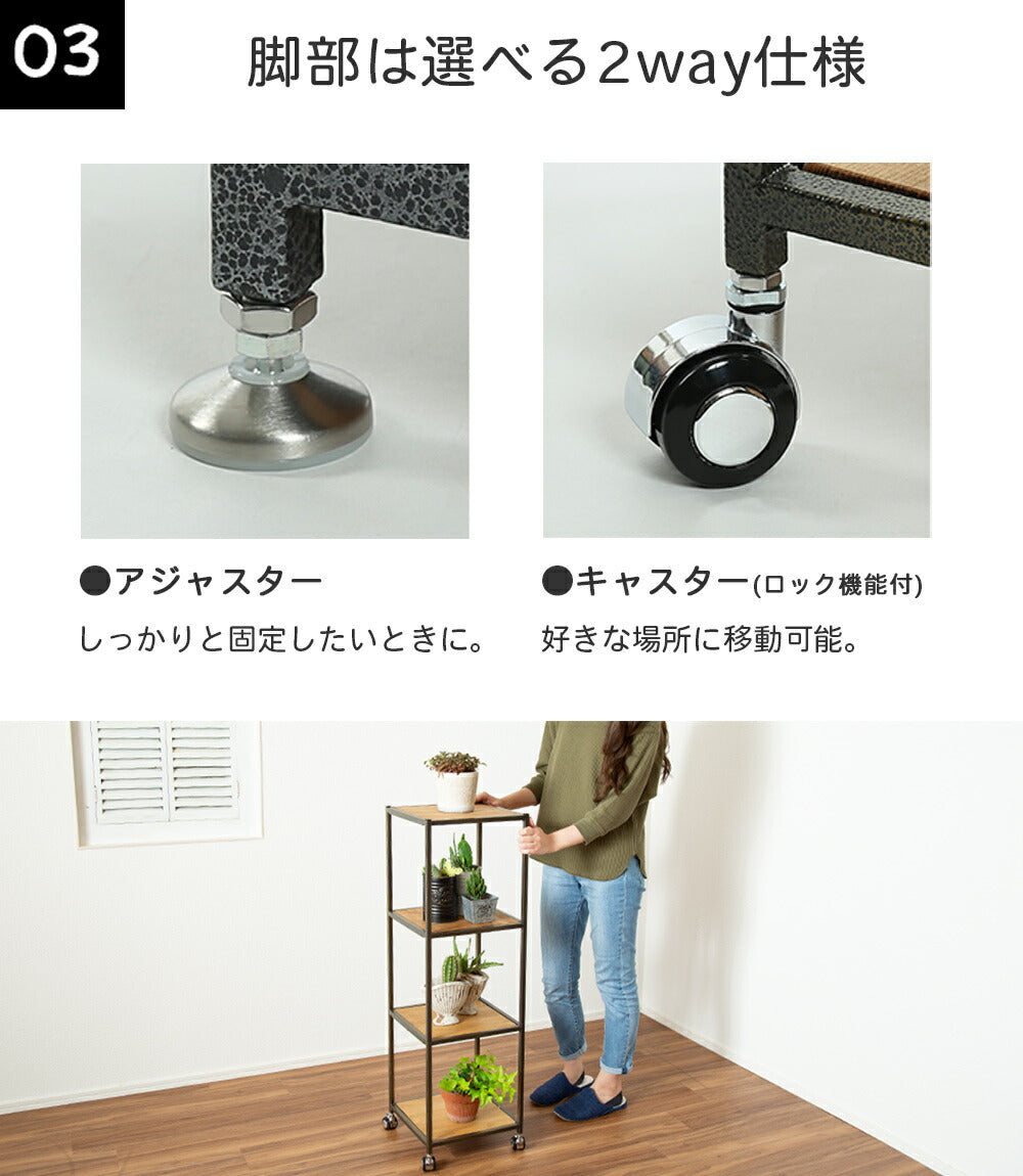 脚部はアジャスターでの設置と移動が可能なキャスター(ロック機能あり)の2通りの使い方ができます。キャスターを使えば模様替えしたいときにもディスプレイをしたまま動かせます。