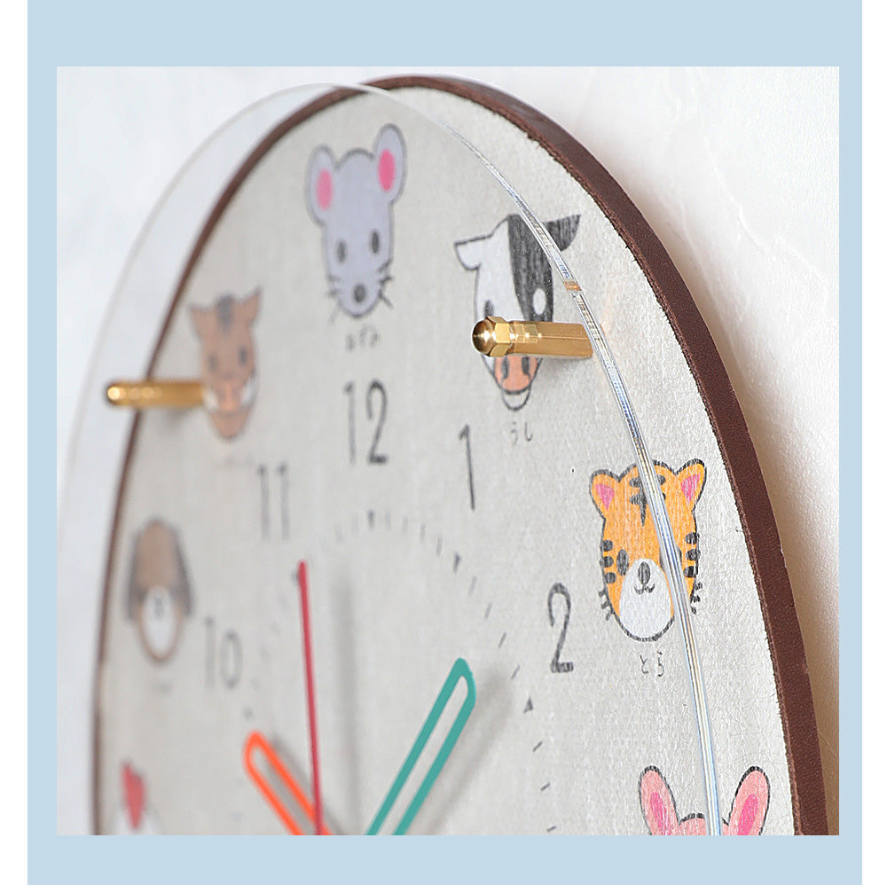 十二支の動物たちがとってもかわいい知育時計。静かで寝室にも適した掛け時計で、親子のコミュニケーションをとりながら楽しく学べます。
