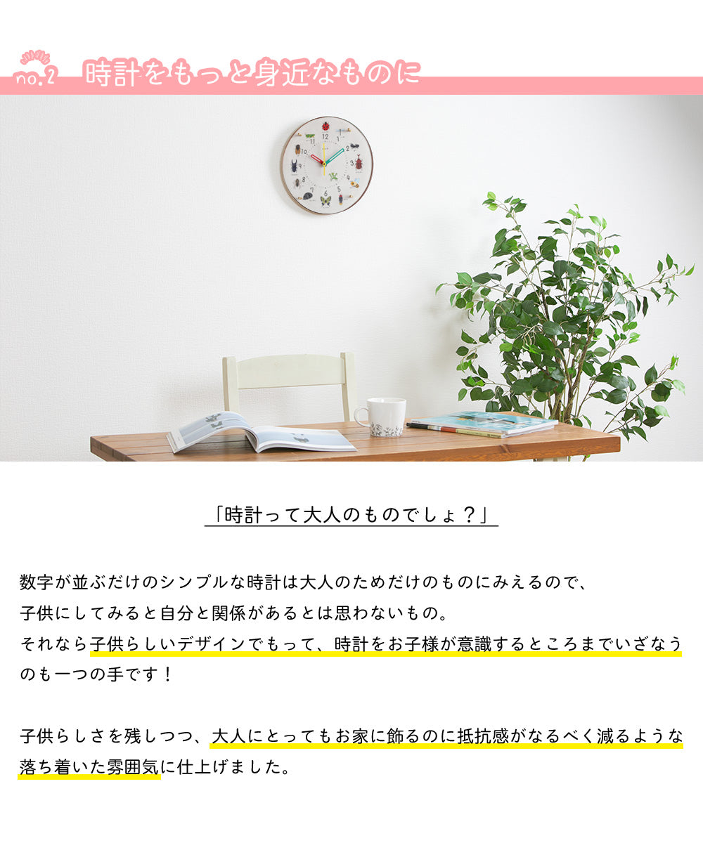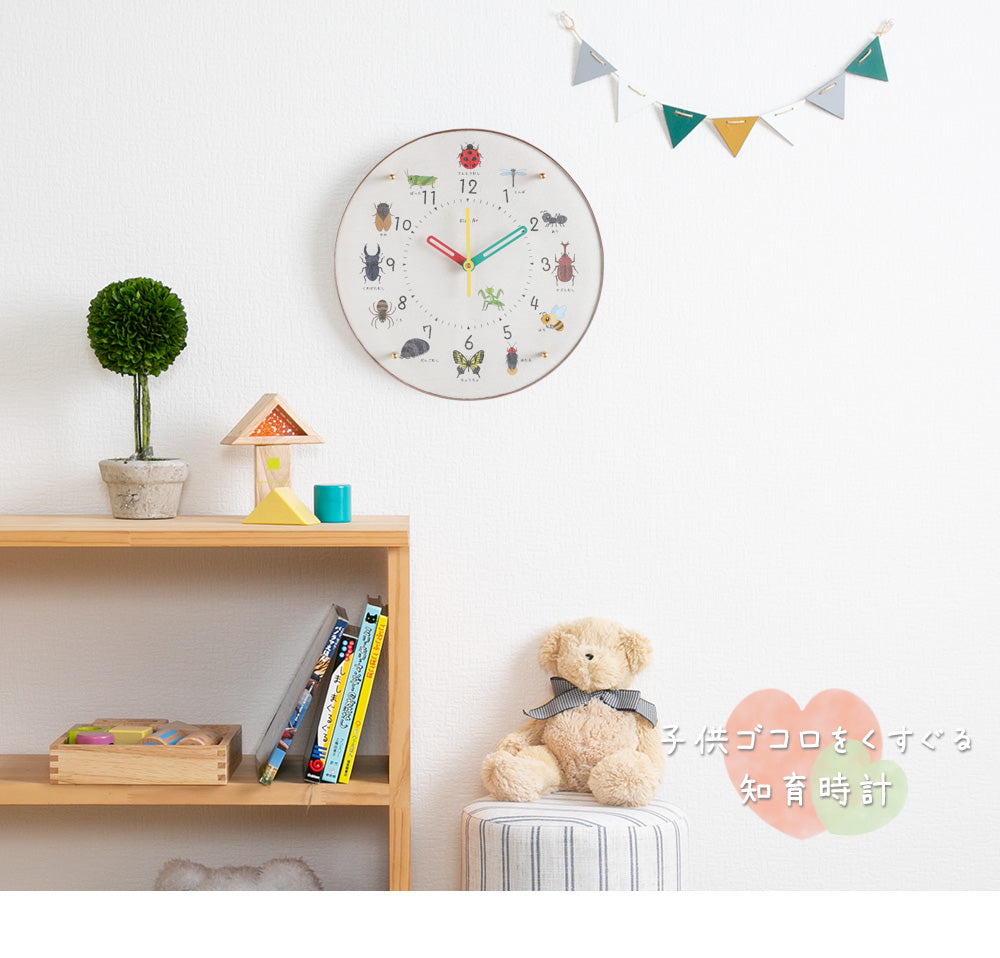 子供が大好きな虫をモチーフにした知育時計。静かで寝室にも適していて、電波時計だから時間も正確です。