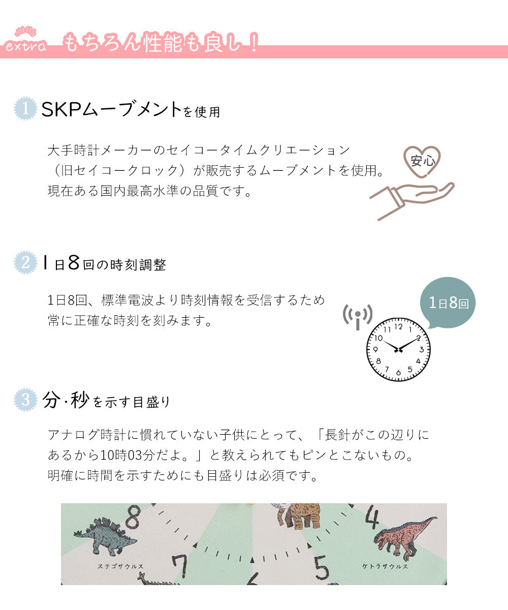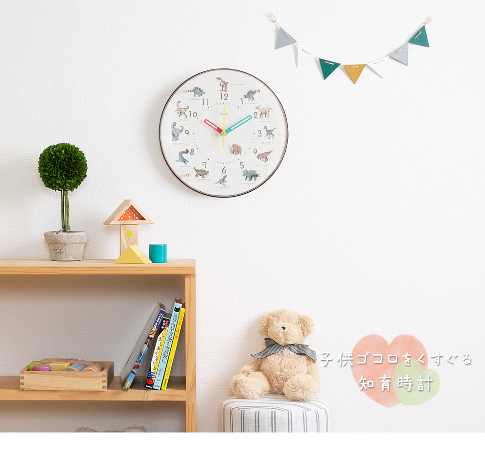 子供が大好きな恐竜をモチーフにした知育時計。静かで寝室にも適していて、電波時計だから時間も正確です。