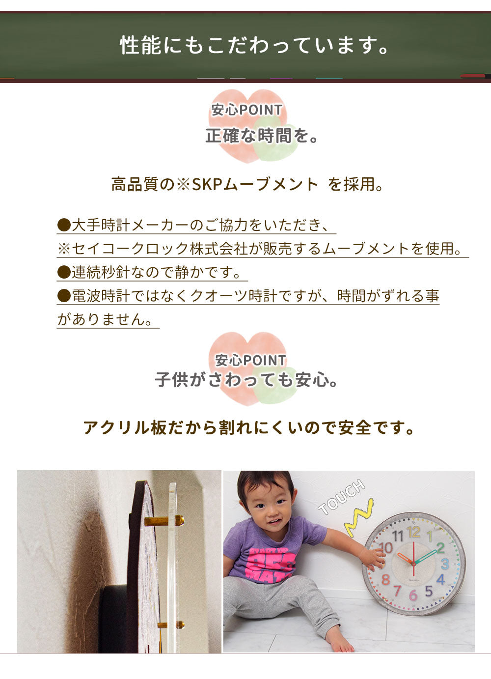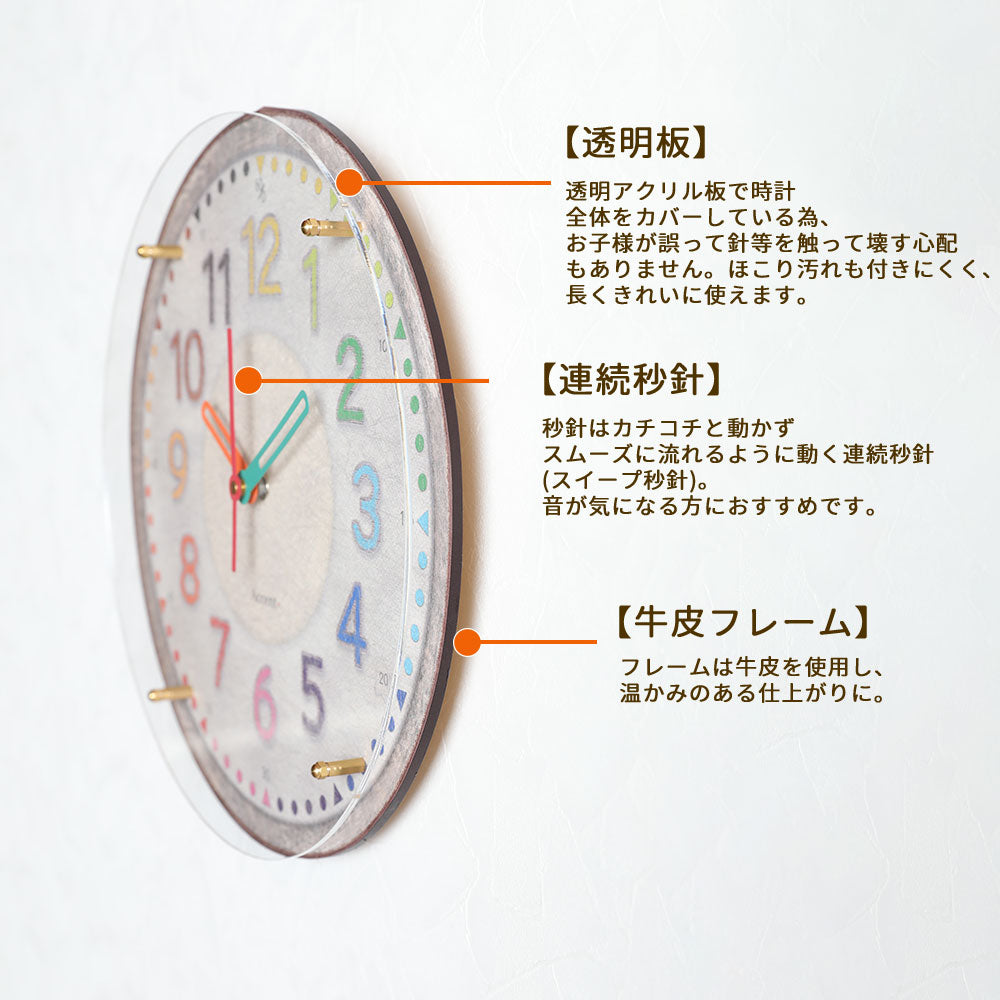 一般の知育時計の様に、イラストや平仮名等が入っておらず、 子供すぎない北欧デザインです。