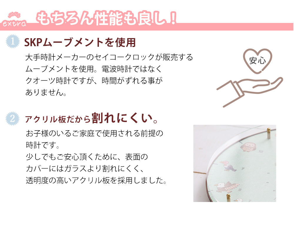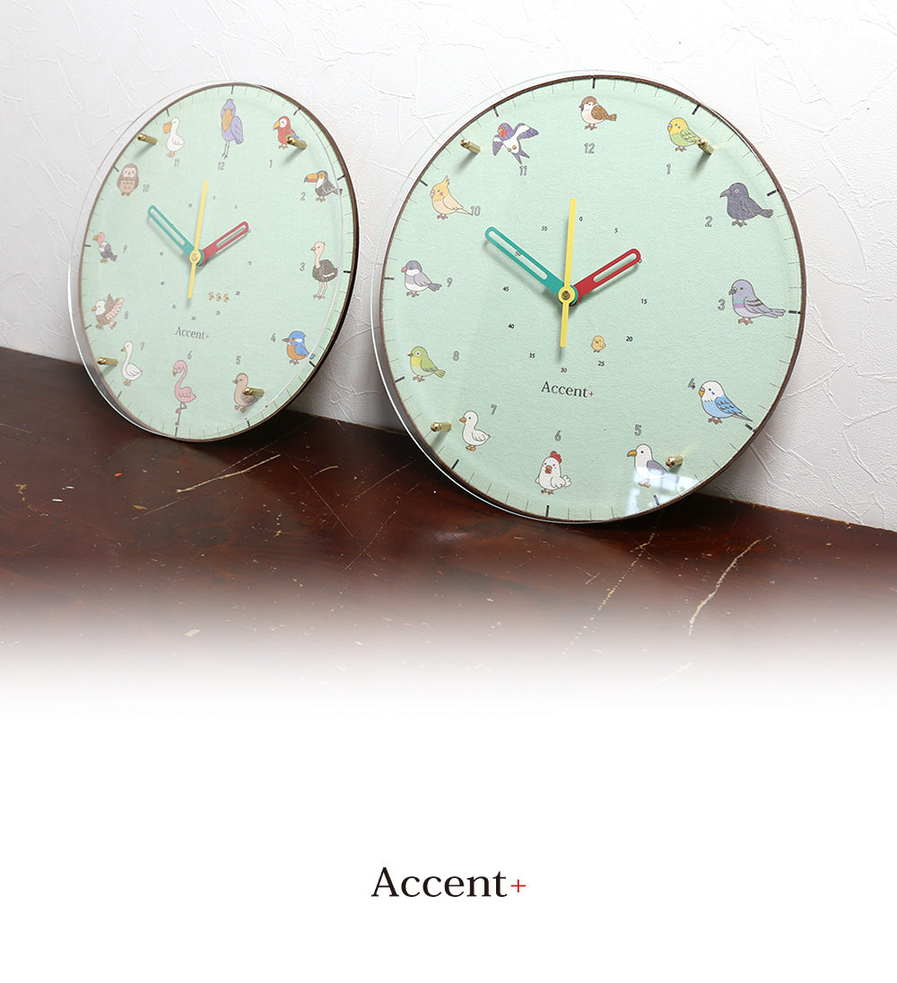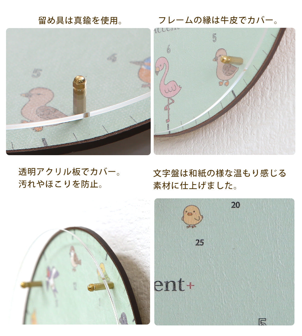 愛らしいタッチの鳥さんたちが描かれ、安らぎのある優しい色合いの時計にデザインしました。