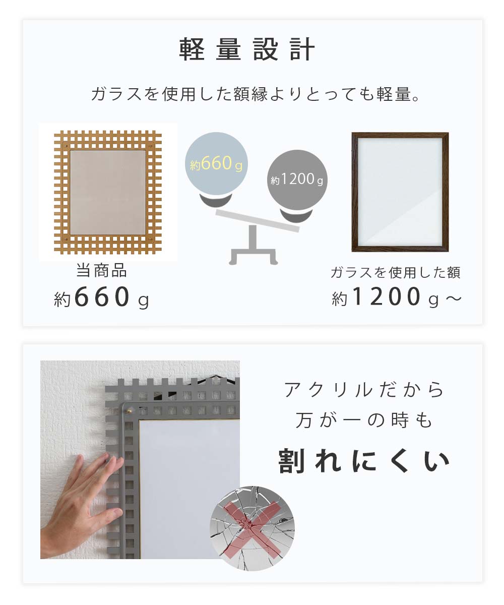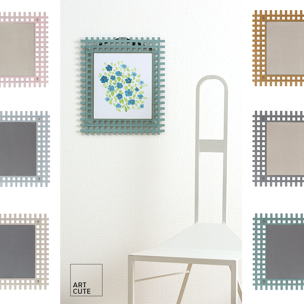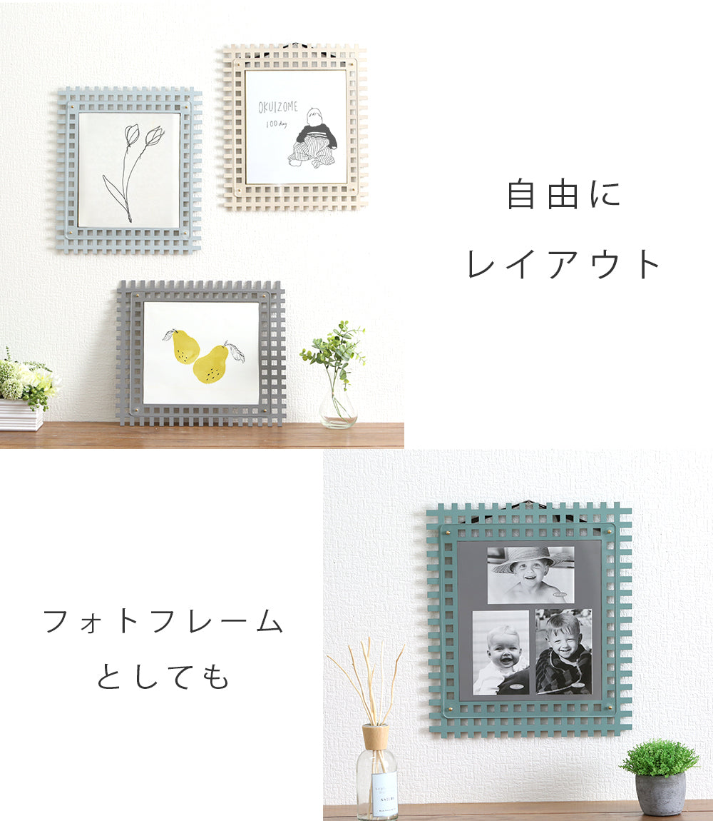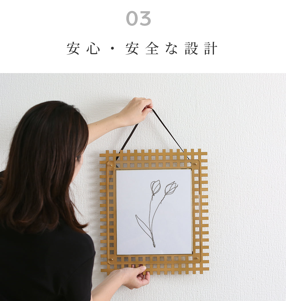 格子のデザインフレームは、ガラスの額縁とくらべて軽量なので裏の紐で壁のフックにかけたり、棚や玄関に雑貨と組み合わせて立て掛けたりと、お気に入りの場所に飾ることが出来ます。