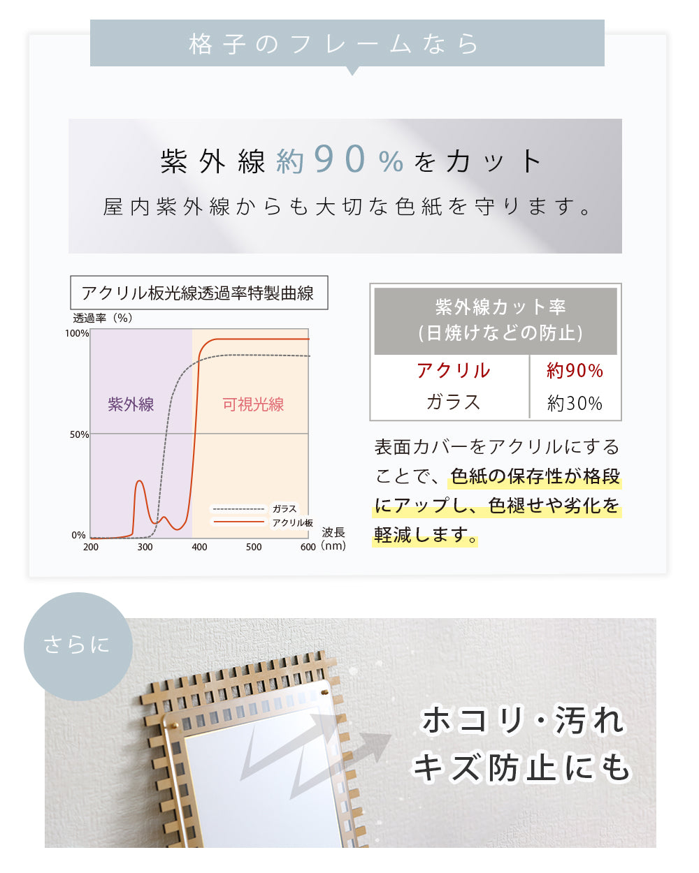 アクリルの持つ特徴として室内の紫外線であれば90%程度カット。長年の蓄積による日焼けから守ることを考えると表面のカバーをアクリルにすることが最適といえます。またフレームに入れることで、ホコリや汚れ、キズからも色紙を守り、色紙の劣化を軽減することができます。