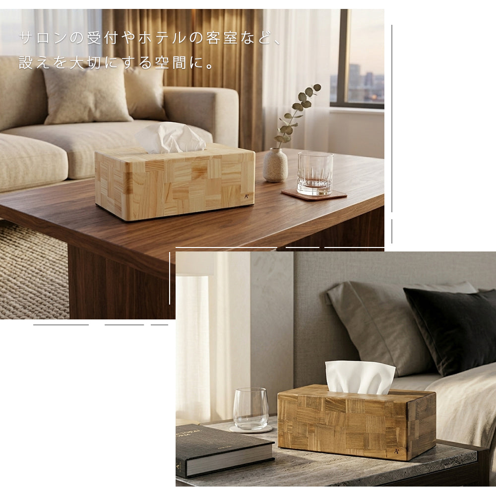ティッシュカバー ティッシュボックス ティッシュケース タオルペーパーボックス タオルペーパーケース タオルペーパー収納 薄型 厚型 卓上 ホテル 旅館 サロン 重厚感 高級感 ナチュラルモダン ジャパンディ ミニマルモダン 交目寄せ木 木製 ヒノキ ひのき 檜 桧 新築祝い 引っ越し祝い ギフト 贈り物 プレゼント 国産 日本製