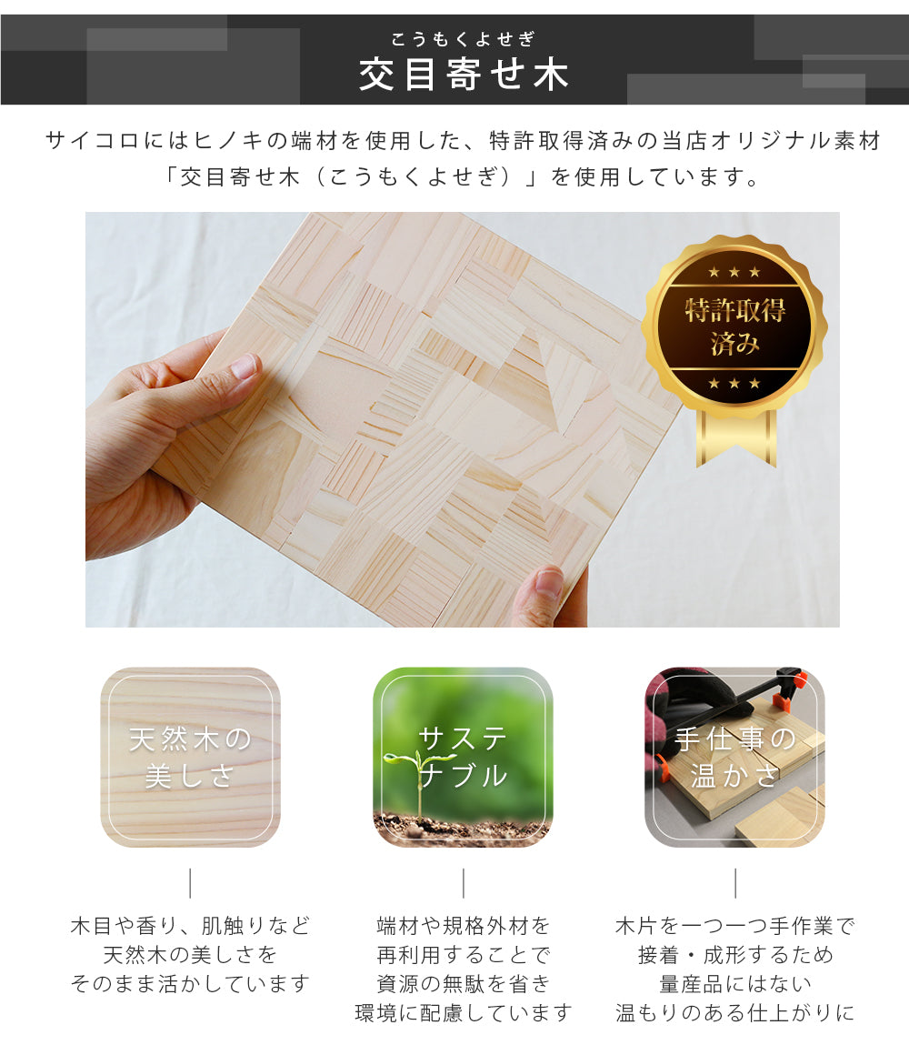 交目寄せ木(こうもくよせぎ)とは、国産ヒノキの端材を活用した、特許取得済みの当店オリジナル素材です。天然木ならではの美しい木目や香りをそのままに、環境にも配慮。ひとつひとつ日本の職人が丁寧に仕上げています。