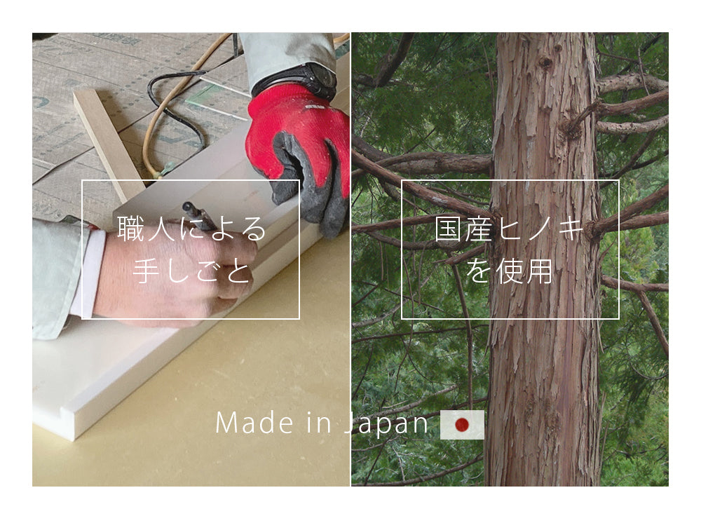 「Made in Japan」にこだわり、ひとつひとつ丁寧に職人が仕上げています。また、木材には国産ヒノキを使用。少しでも森林保全に貢献できればと考えています。届いた箱を開けた時に、ふんわり漂う自然なヒノキの香りをお楽しみください。